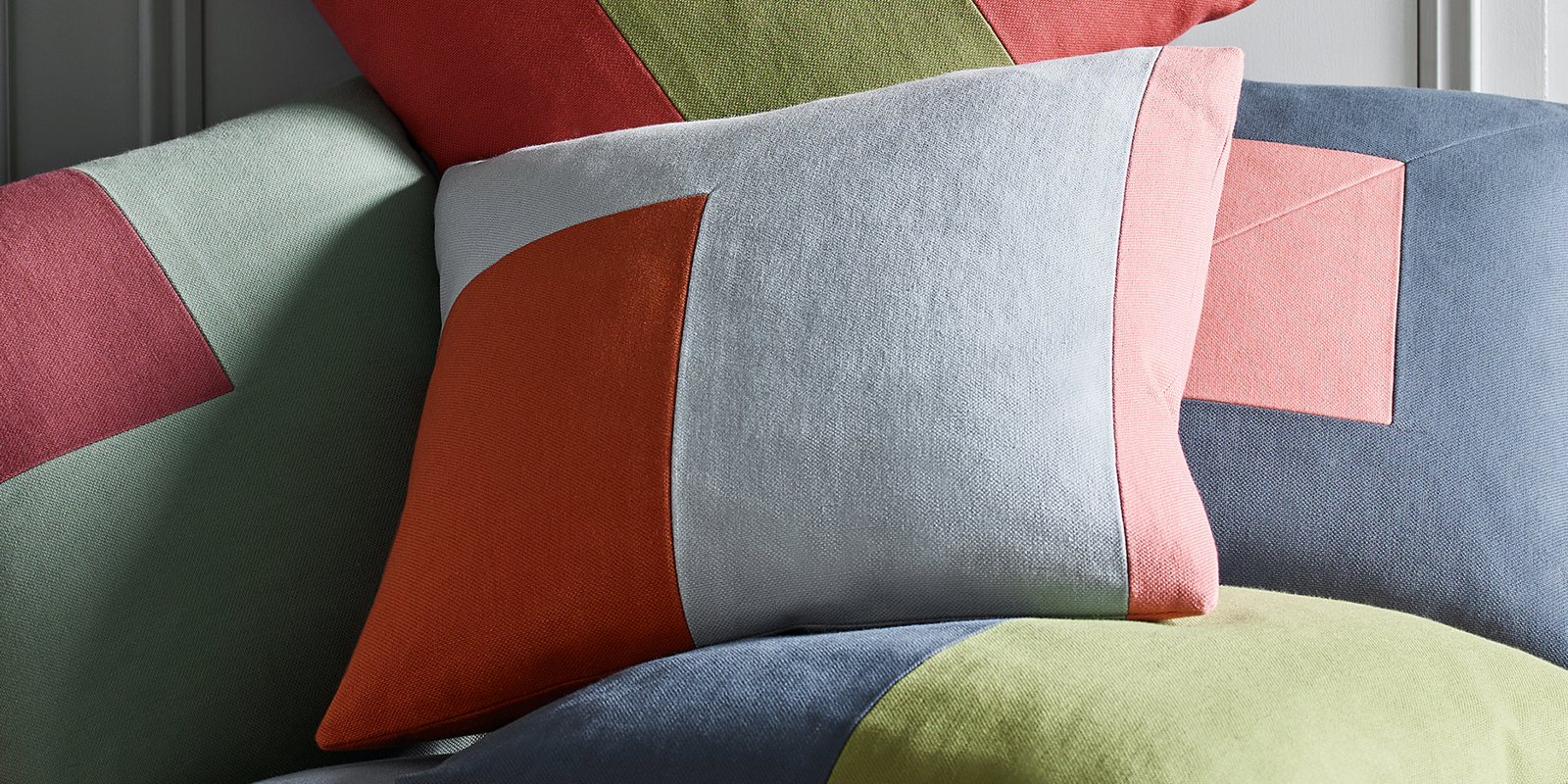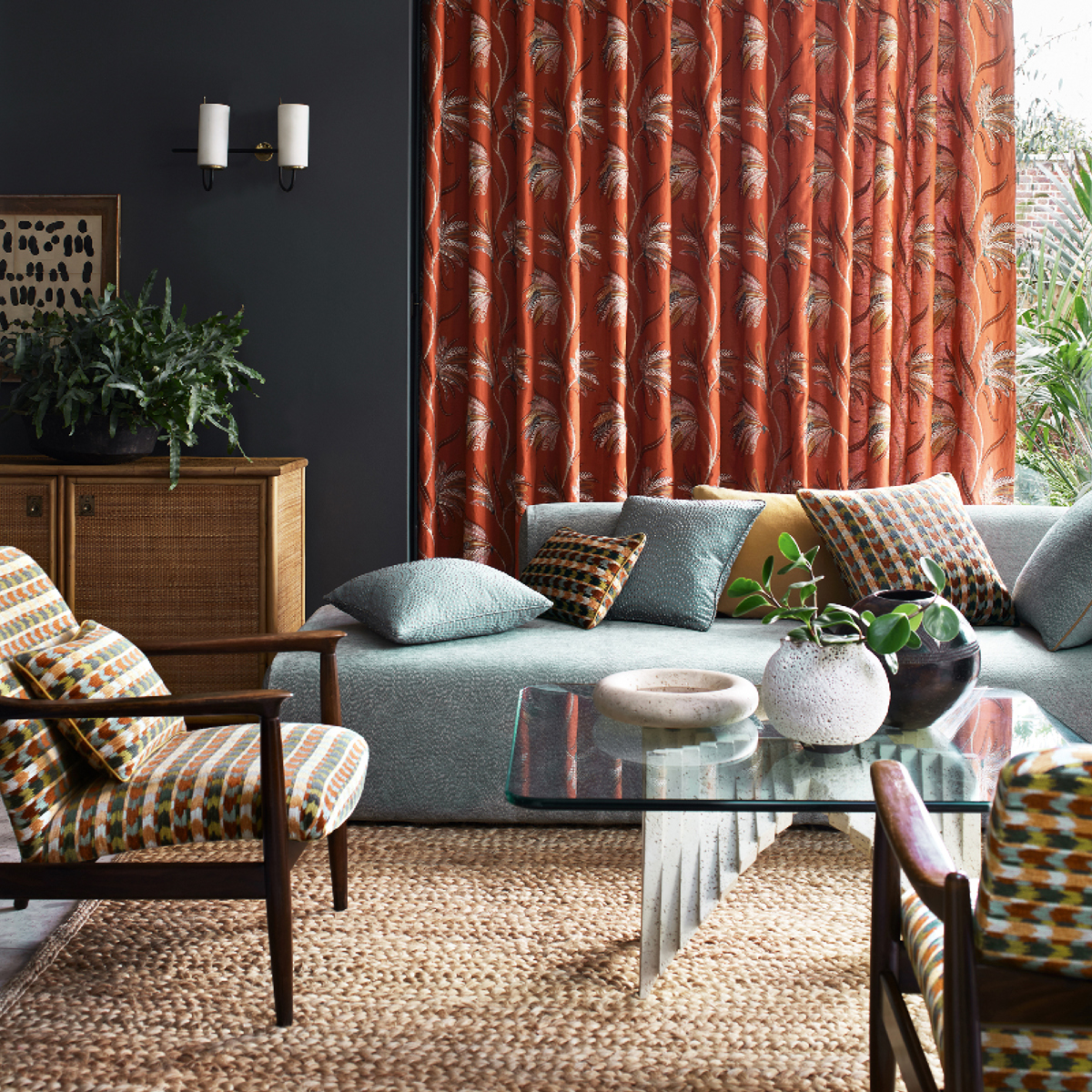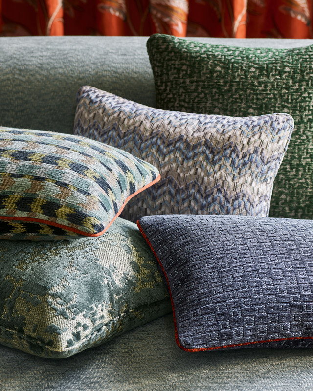 An enticing combination of lustrous velvets and richly coloured geometric weaves.